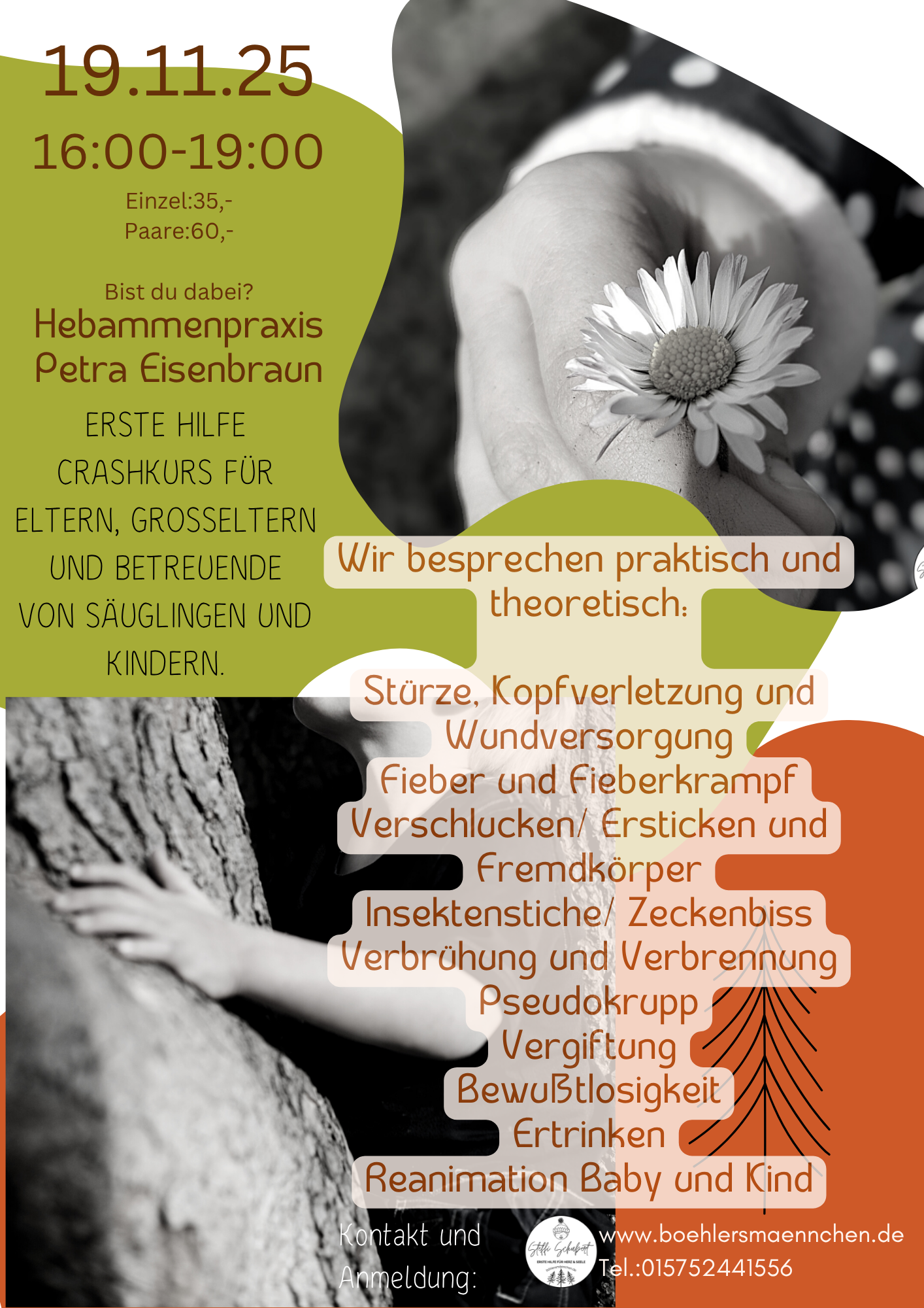 Mein Wissen für Ihre & ihre Sicherheit! Ob als Eltern, Babysitter:in, Großeltern oder einem erweiterten Kreis von Bezugspersonen: ist ein Kind krank oder verunfallt, sind eine schnelle und sichere Reaktion in mehreren Ebenen enorm wichtig. Um Ihnen diese Sicherheit zu geben und somit den Kindern durch sichere Bezugspersonen einen bestmöglichen Rahmen für deren gesunde Entwicklung zu bieten, gebe ich verschiedene Workshops zu den Themen "Kindernotfälle" und "Kinderkrankheiten". Und damit bestenfalls einfach nichts passiert, sind die entsprechenden Präventionsmaßnahmen natürlich inklusive.